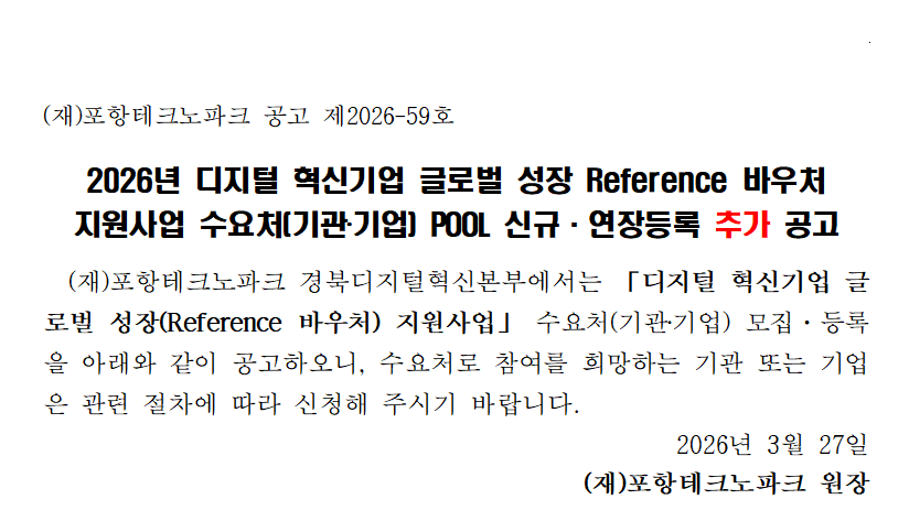 2026년 디지털 혁신기업 글로벌 성장지원 Reference 바우처 지원사업 수요처 POOL 모집·등록 공고(추가)